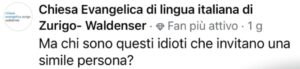 signora Paola Bernardi, ricopre ruoli di rappresentanza nella Chiesa Valdese di Zurigo e nella